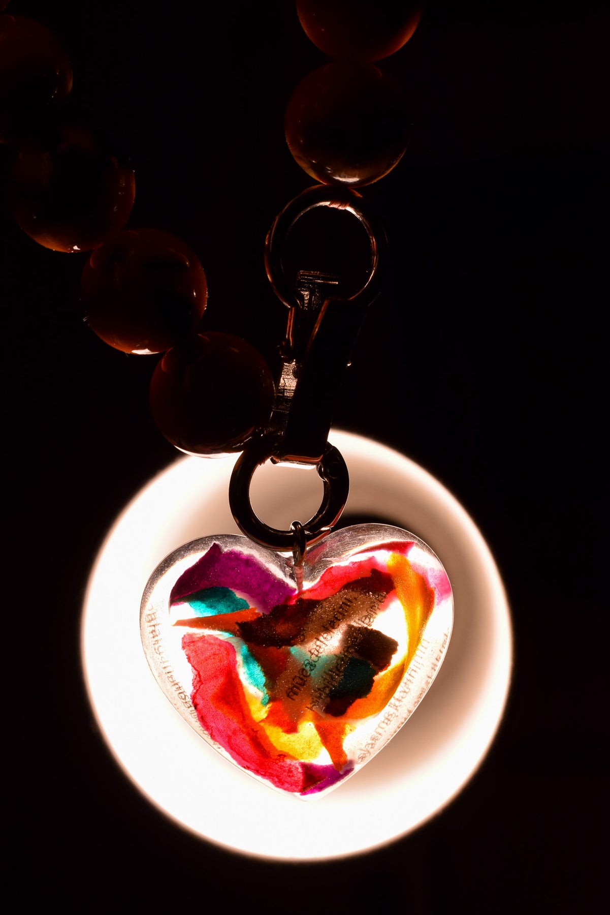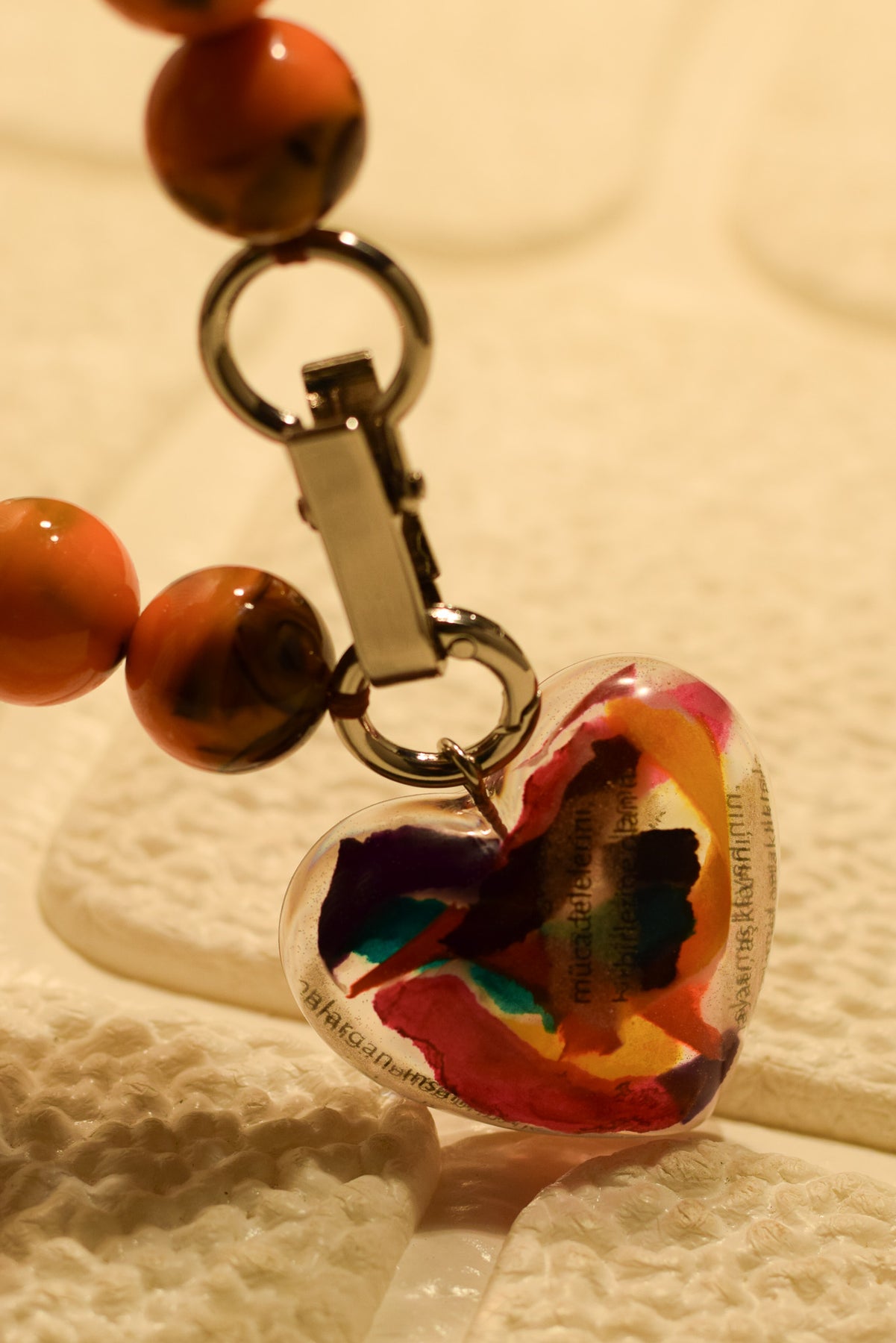 Burhan Doğançay'ın resimlerinden esinlenerek yaptığımız bu kolye içerisinde renkli kağıt kesikleri ve kelimeler barındırmaktadır.